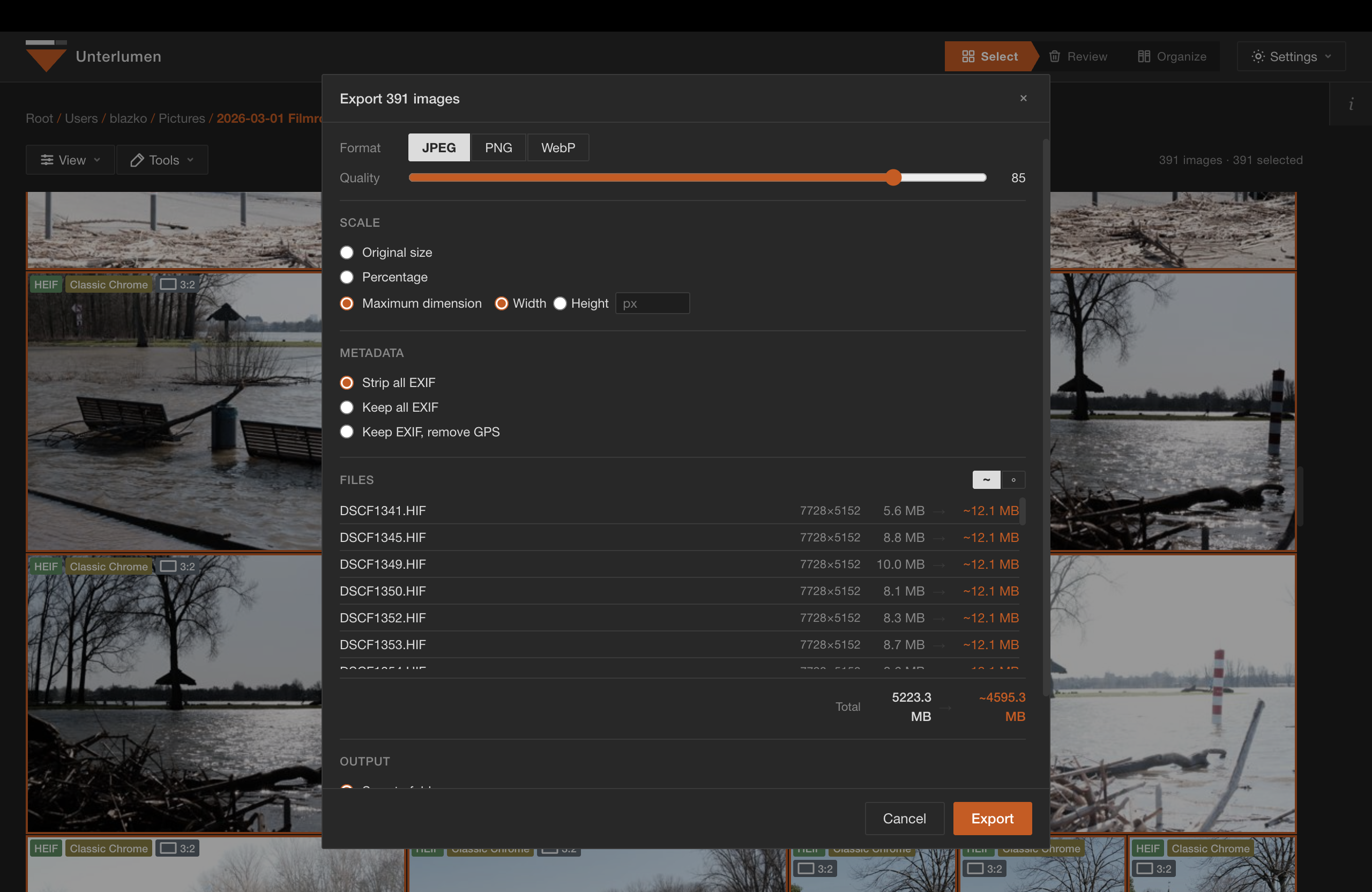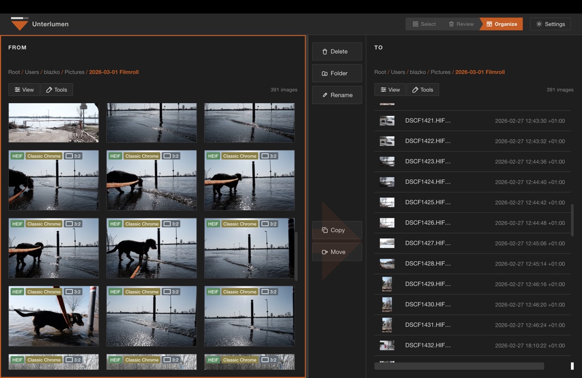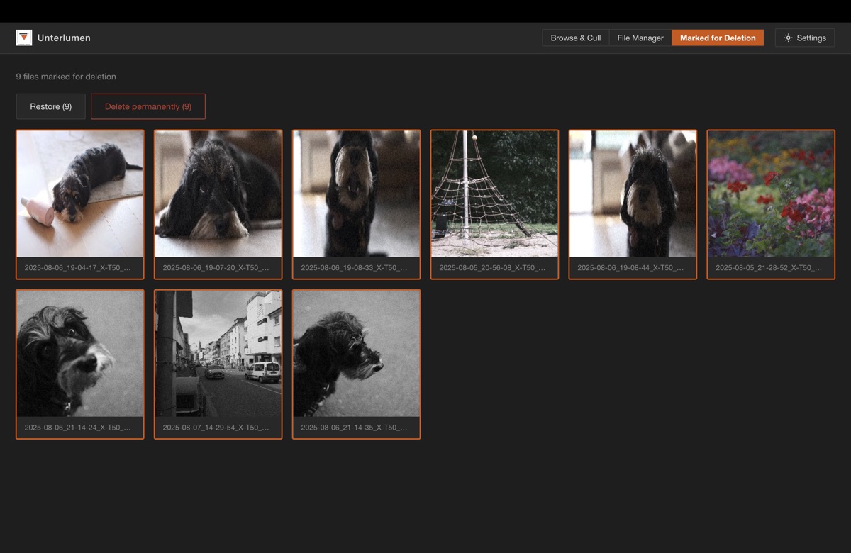 Unterlumen runs as a local web server and lets you browse your photo library right in your browser. View images full-screen, organize files using a dual-pane file manager, and cull your shots — all without uploading anything anywhere.